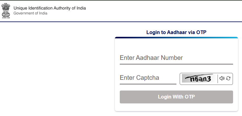 Step 2. अब आपको आधार नंबर डालकर और नीचे काप्चा भरकर के Login with OTP पे क्लिक करना होगा –